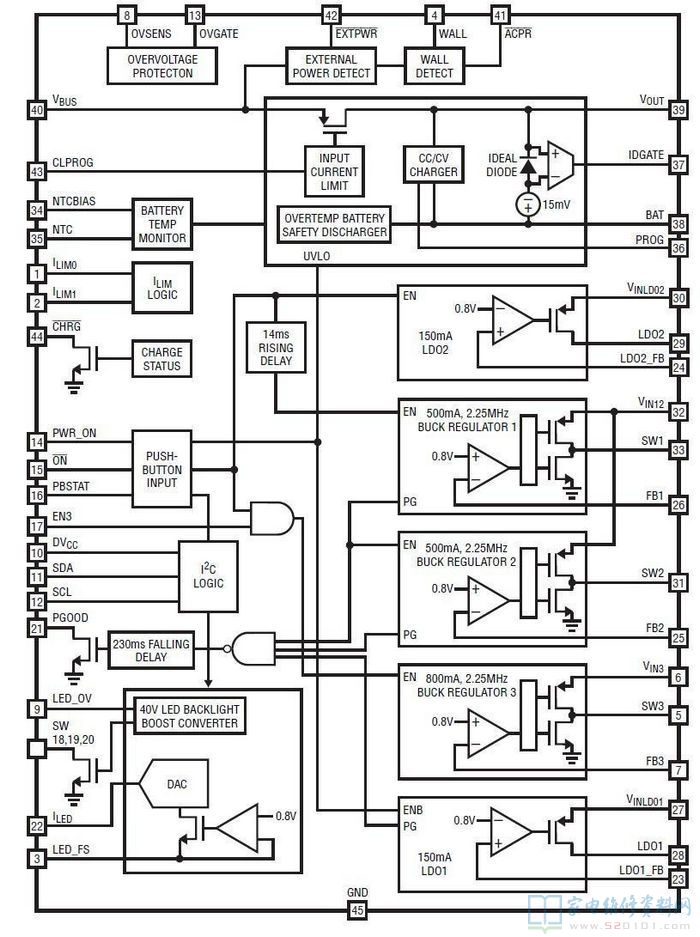 3个集成的同步降压型稳压器以 100% 占空比工作,能够分别提供 800/500/500mA 的输出电流,并具有低至 0.8V 的可调输出电压。2.25MHz 的高开关频率允许使用高度不到 1mm 的纤巧低成本电容器和电感器。内部低 RDS(ON) 开关实现高达 95% 的效率,从而进一步最大限度地延长电池运行时间。此外,I2C 控制的突发模式 (Burst Mode?) 工作以每稳压器仅 20uA 的静态电流 (停机时 <1uA) 优化了轻负载时的效率。此外,这些稳压器用陶瓷输出电容器可稳定,从而实现了非常低的输出电压纹波。