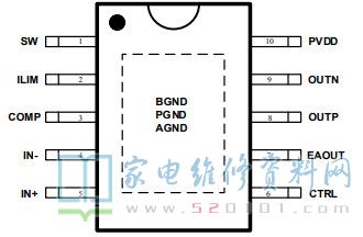 | 3 | COMP | Output of the internal error amplifier, the loop compensation network should be connected between this pin and the PVDD pin. 环路补偿脚,接补偿电路到PVDD。 |