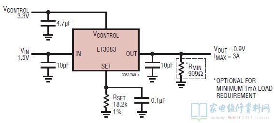 可在任意的输出电压条件下实现无可比拟的稳压性能 (误差低于 2mV)。该器件具有 1.2V 至 18V (DD-Pak 和 TO-220 封装) 的宽输入电压范围,满负载时的压差仅为 310mV (当采用单独的偏置电源工作)。输出电压可用单个电阻器在 0V 至 17.5V 范围内编程,内置的已微调 50uA 电流基准微调至 ±1%。由于该器件采用电压跟随器架构,因此调节和输出噪声 (40uVRMS) 不受输出电压影响。大输出电流、宽 VIN 和 VOUT 能力、严格的电压和负载调节、高纹波抑制、少数量的外部组件和并联功能使 LT3083 非常适用于新式和较大电流的多轨系统。