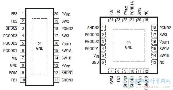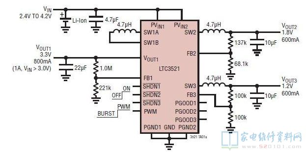 同步降压-升压型通道所采用的拓扑在所有工作模式之间提供连续转换,从而非常适用于甚至在电池电压下降至低于输出时也必须保持恒定输出电压的应用。在很多情况下,这能增加多达 20% 的电池运行时间。其降压-升压型通道可以提供 1.8V 至 5.25V 的恒定输出电压,而每一个同步降压型通道则能够提供 0.6V 至 5.25V 的输出,从而使该器件适用于多种手持式应用。恒定 1.1MHz 开关频率可实现低噪声工作,同时最大限度地减小了外部组件的尺寸。