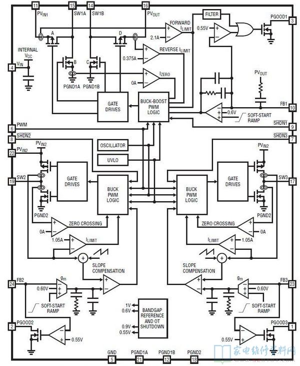 同步降压-升压型通道提供连续传导工作,以在宽输入电压范围内最大限度地提高效率,同时最大限度地降低开关噪声。降压型转换器采用电流模式控制和同步整流以确保最佳效率。该器件的可选突发模式 (Burst Mode?) 工作仅需要 30uA 静态电流,且停机电流低于 2uA,从而进一步延长了电池运行时间。就需要最低噪声的应用而言,可以配置为以固定频率 PWM 模式运行,这可降低噪声和潜在的 RF 干扰。其它特点包括:内部补偿、集成的软启动和用于每个通道的电源良好 (Power Good) 输出。