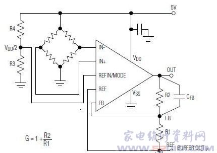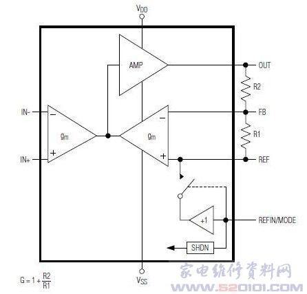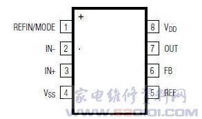 概述:MAX4208采用3mm×5mmμMAX8脚封装,采用2.85V至5.5V单电源供电,仅消耗750&mICro;A静态电流(内部缓冲器关断),关断模式下仅消耗1.4µA。REF接地、REFIN/MODE接VSS时,还可采用±2.5V双电源供电。输入失调电压在+25℃时为20μV (最大值),在-40℃至+125℃温度范围内为40μV (最大值)。为超低失调/漂移仪表放大器,具有高精度、低功耗、满摆幅输出、高增益带宽积等特性,并具有带缓冲的REFIN/MODE输入。由于采用频谱扩展和自稳零技术,可以连续测量并校准输入失调,消除时间漂移、温度漂移、1/f噪声的影响。具有750kHz的增益带宽积。增益可通过两个外部电阻调节,或将FB连接至OUT配置为单位增益。带有基准输入(REF),用于建立输出偏置,允许在单电源供电时处理双极性信号。REFIN/MODE是高精度单位增益缓冲器输入,用于设置建立输出偏置的REF电压。内部REF缓冲器可通过简单的电阻分压器设置基准或使用ADC基准,没有任何负载误差。