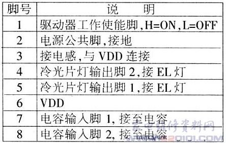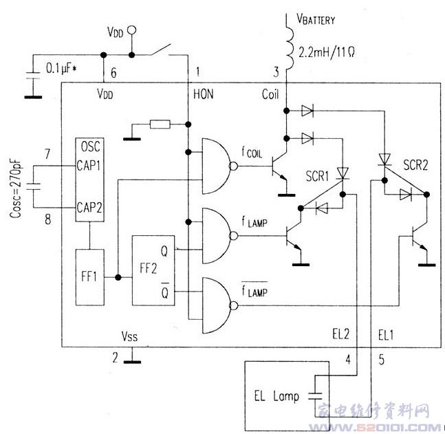 上图中改变电容Cosc,可改变输出频率,EL片的亮度随着振荡频率和电压的增加而提高。增大电容Cosc,振荡频率将下降,供电电流和输出电压上升,亮度通常会先增加,但到最大值后会下降。建议取值范围150pF~400pF,一般在200pF时,振荡频率为400Hz左右,300pF时频率为300Hz左右,此时效果较好。需要注意的是随着电容的增大,EL脚的输出电压是增加了,但有时因EL振荡频率下降亮度反而降低。图中电感,对不同的EL片通常有一个最佳电感值,调整EL片亮度时可先调节电感,再确定电容值。通常增大电感值,工作电流降低,功耗下降。较大的EL片,电感适当加大,再搭配电容,但要注意工作电流与输出性能间的关系平衡。电感的内阻越小,IC的转换效率越高,相同的情况下驱动的EL灯亮度也越高。建议取值范围为470uH~3.3mH。考虑到功耗与亮度的关系,要根据不同的应用和EL片,选择适当的组合。