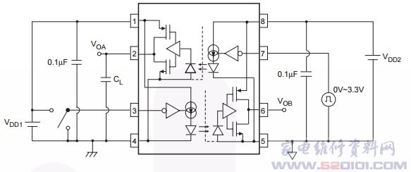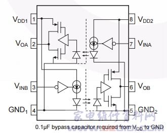 具有高集成度,以双向配置方式集成了两个光耦合通道,每个光耦合器通道由一个高速AIGaAsLED组成,通过一个与CMOS检测器IC耦合的CMOS缓冲器IC驱动。
