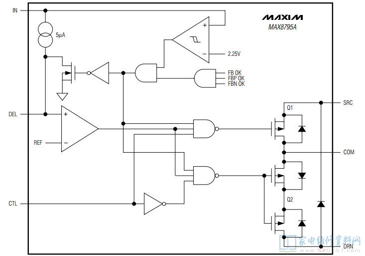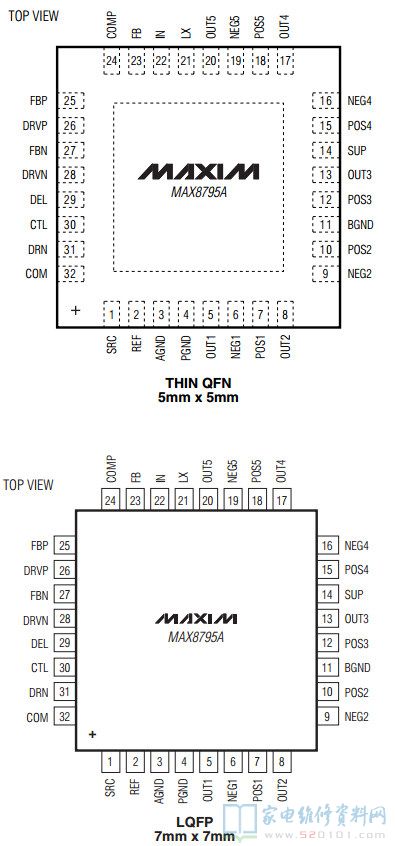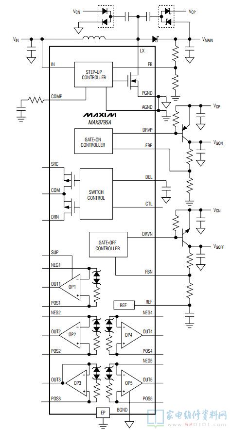 栅极开通、栅极关断线性稳压控制器使用连接在开关节点的外部电荷泵,提供稳定的TFT栅极开通、关断电源。MAX8795A包含5个高性能运算放大器。这些放大器用于驱动LCD背板(VCOM)或gamma校正分压器。器件提供高输出电流(±130mA),高压摆率(45V/?s),宽频带(20MHz)以及满幅度输入输出。