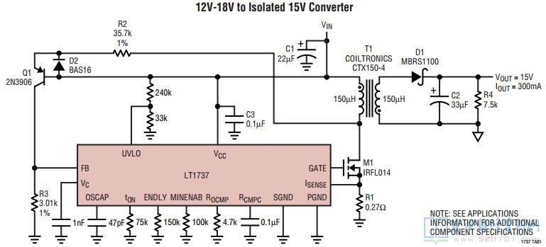 概述:LT1737采用16脚SO封装。无需使用传统的光隔离器和其他附加电路感应输出电压即可提供隔离的回扫开关电源,直流输入电压在4.5V至20V之间。