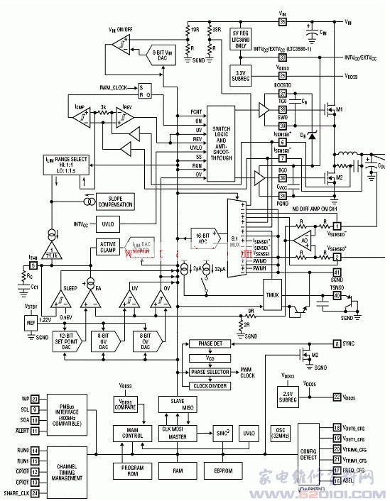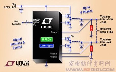 概述:LTC3880采用耐热增强型6mmx6mmQFN-40封装,采用恒定频率电流模式架构。VIN输出电压从4.5V到24V,输出电压VOUT从0.5V到5.5V,输出电压对温度的变化为±0.5%.器件集成了15位ADC,主要用在大电流分布电源系统,通信,数据通信和存储器系统以及智能能效的电源系统。