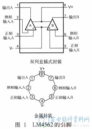 LM4562共有8个引脚,如图1所示。其封装形式为SOIC、Plastic DIP、TO-99金属封装,如图2 所示。附表为LM4562的电气特性。测试条件为Vs=±15V、RL=2kΩ、Rsource=10kΩ、fin=1kHz,除非特别说明,TA=25℃。典型值在25℃下确定,代表参数的标准。在测试条件范围内,美国国家半导体公司保证性能指标。PSRR由此测得:在±5V和±15V两个电压下测得Vos,PSRR=|20log(△Vos/△Vs)|。