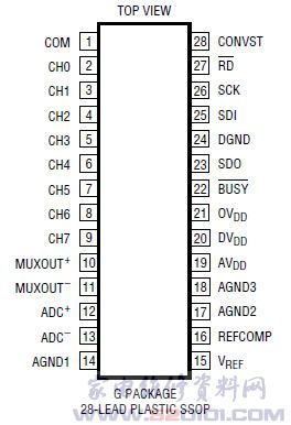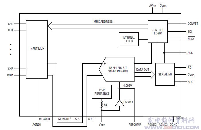 LTC1856 的多路复用器可以配置为接受 4 个差分输入、8 个单端输入、或差分输入与单端输入的混合。这个 ADC 在整个温度范围内具有 15 位无漏码 DC 性能和 ±3 LSB(最大值)INL。LTC1856 还实现了 87dB SINAD 和 -101dB THD 的卓越 AC 性能,并为仪表、工业过程控制等多通道高分辨率应用而优化。