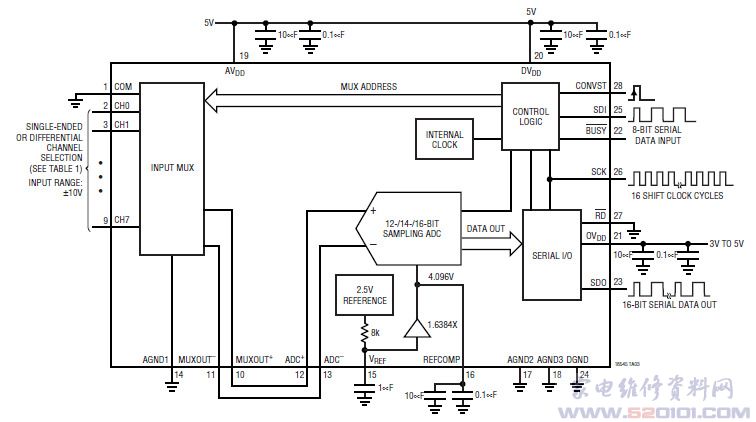 LTC1856 用单 5V 电源工作,在 100ksps 时仅消耗 40mW 功率。LTC1856 具有 2.5V 内部基准,典型温度系数为 ±10ppm/oC,该器件还可以从外部驱动以提高准确度。就功率敏感应用而言,LTC1856 提供两种断电模式,其中在基准工作的打盹模式时,功耗降至 27.5mW,在基准断电的休眠模式时,功耗为 40uW。