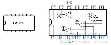 LM339集成块采用C-14型封装,图1为外型及管脚排列图。由于LM339使用灵活,应用广泛,所以世界上各大IC生产厂、公司竟相推出自己的四比较器,如IR2339、ANI339、SF339等,它们的参数基本一致,可互换使用。
