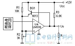 下图为某电磁炉电路中电网过电压检测电路部分。电网电压正常时,1/4LM339的U4<2.8V,U5=2.8V,输出开路,过电压保护电路不工作,作为正反馈的射极跟随器BG1是导通的。当电网电压大于242V时,U4>2.8V,比较器翻转,输出为0V,BG1截止,U5的电压就完全决定于R1与R2的分压值,为2.7V,促使U4更大于U5,这就使翻转后的状态极为稳定,避免了过压点附近由于电网电压很小的波动而引起的不稳定的现象。由于制造了一定的回差(迟滞),在过电压保护后,电网电压要降到242-5=237V时,U4