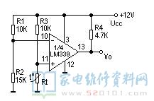 图3为某仪器中过热检测保护电路。它用单电源供电,1/4LM339的反相输入端加一个固定的参考电压,它的值取决于R1于R2。UR=R2/(R1+R2)*UCC。同相端的电压就等于热敏元件Rt的电压降。当机内温度为设定值以下时,“+”端电压大于“-”端电压,Uo为高电位。当温度上升为设定值以上时,“-”端电压大于“+”端,比较器反转,Uo输出为零电位,使保护电路动作,调节R1的值可以改变门限电压,既设定温度值的大小。