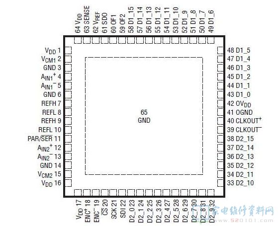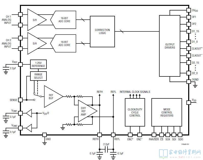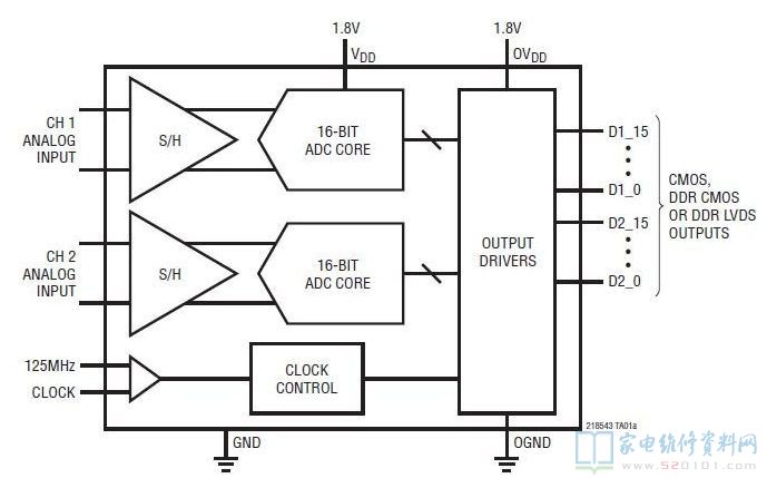数字输出可以是全速率 CMOS、双倍数据速率 CMOS 或双倍数据速率 LVDS。一个单独的输出电源提供了 1.2V 至 1.8V 的 CMOS 输出摆幅。
