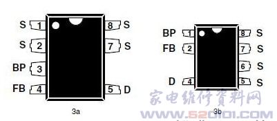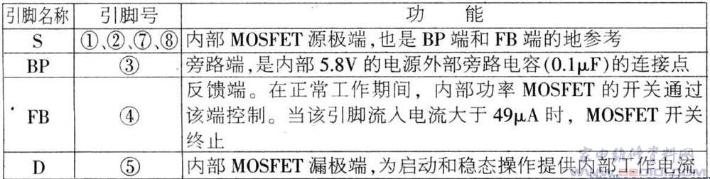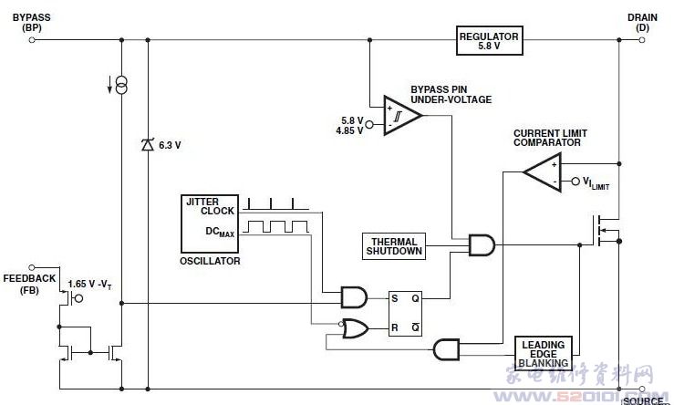 概述: 采用8引脚DIP或SMD封装,集成了一个700 V的功率MOSFET、振荡器、简单的开/关控制电路、高压开关电流源、频率调制、逐周期的电流限制及过温保护电路。器件在启动及工作期间的功率消耗直接由漏极引脚的电压来提供,因此在BUCK及反激式转换器中可节省偏置供电的相关电路。完全集成的自动重启动电路在短路、开环的故障情况下,安全地限制了输出功率,减少了元器件的数目,降低了在系统级用于负载保护电路的成本。如有必要,IC的自供电操作允许使用没有安规要求的光耦器作为电平转换,以改善输入电压调整率及负载调整率。具有反馈(感测和逻辑)电路、5.8V的稳压器、旁路脚(BP端)欠电压比较器、过温度保护电路、频率颤抖与电流限制电路及前沿消隐电路等。 MDCM的平方为63mA,CCM的立方为80mA。
