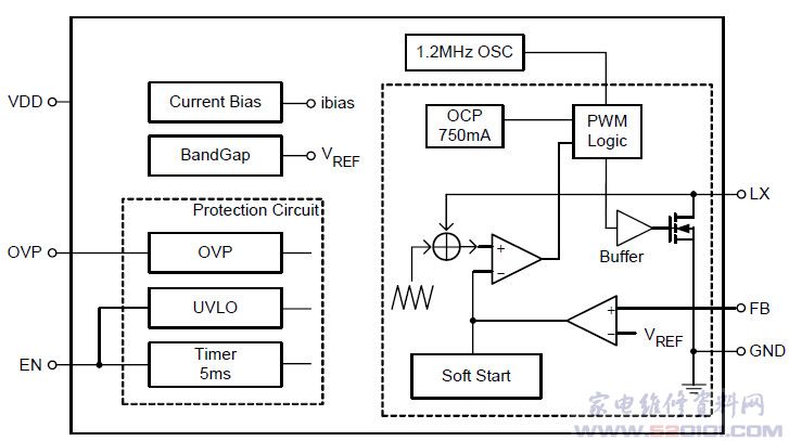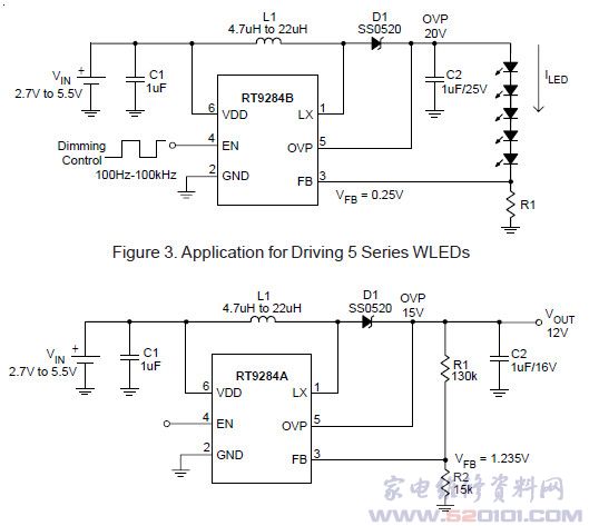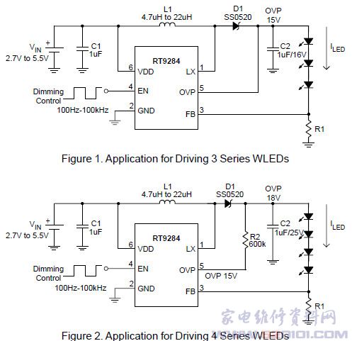 概述:RT9284采用TSOT-23-5和TSOT-23-6封装。为100Hz~100KHz微控频率升压型白光LED驱动电路,可同时驱动4颗串联白光LED,能完全避免噪音产生。在白光LED出现异常情况下,具有过电压保护功能。