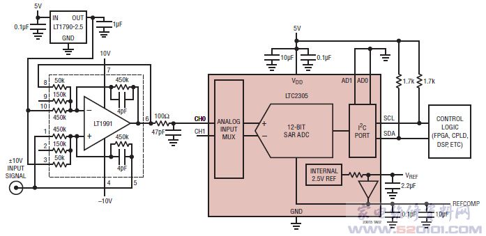±1LSB INL 和 DNL、±2mV (最大值) 零标度误差和 ±1LSB (最大值) 满标度误差。AC 输入信号数字化在 1kHz 时实现了73dB SINAD 和 –88dB THD。能进行高达400kHz 的 I2C 数据传送,允许高达14ksps 的采样速率。数据可以通过 3V 或 5V 逻辑传送。这些 ADC 包括两个可连接到低、高或置于浮动状态的地址选择引脚,允许选择 9 个独立 I2C 地址中的任何一个。