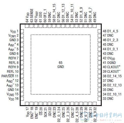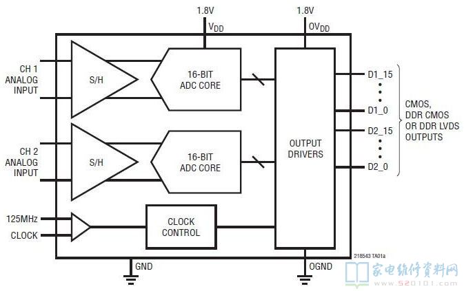 数字输出可以是全速率 CMOS、双倍数据速率 CMOS 或双倍数据速率 LVDS。一个单独的输出电源提供了 1.2V 至 1.8V 的 CMOS 输出摆幅。