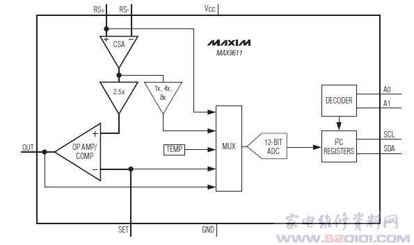概述:MAX9611采用小尺寸、3mm x 5mm、10引脚?MAX封装。集成了I²C控制的12位、500sps ADC,用于读取检流电阻的电流数据、输入共模电压、运算放大器/比较器输出、运算放大器/比较器基准电压和内部管芯温度。I²C总线兼容1.8V和3.3V逻辑电平,能够与目前的微控制器直接连接。具有同相输入-输出配置,较宽的输入共模电压范围(0V至+60V),可编程满量程检测电压(440mV、110mV和55mV)可提供较宽的动态范围、精确的电流测量,并可灵活选择检流电阻的阻值。