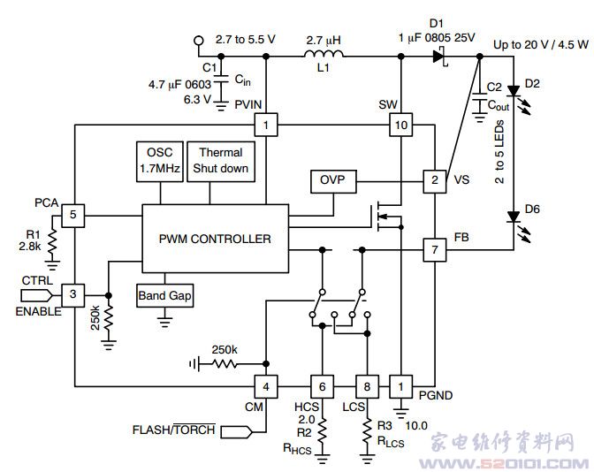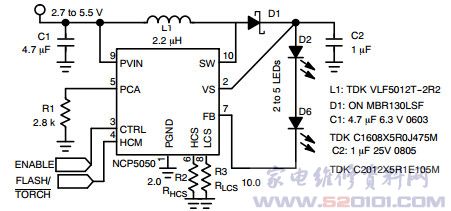 概述:NCP5050采用10脚封装,具备4.5W高功率驱动能力,可以500mA的驱动电流推动两列串联的LED。