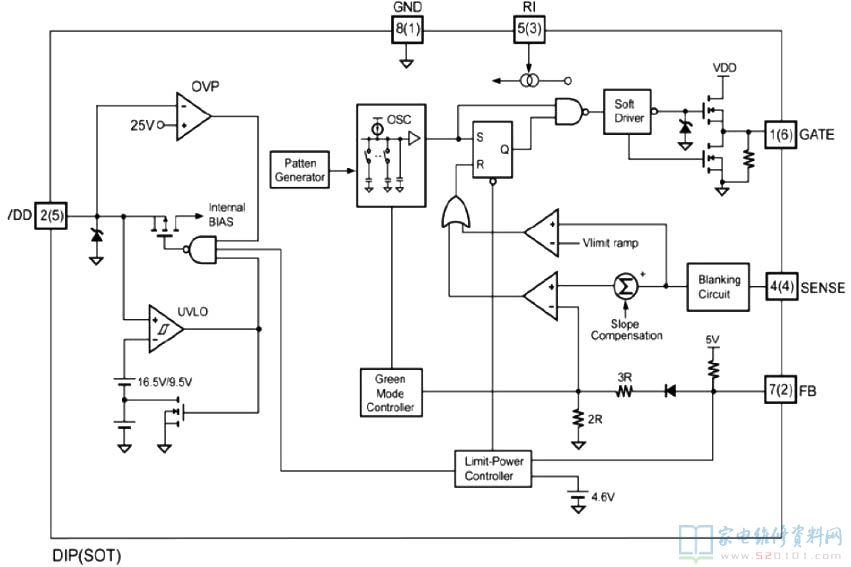 5脚(RI):该引脚和地之间的电阻决定芯片工作频率,f(KHz)=6650/RI(KΩ);