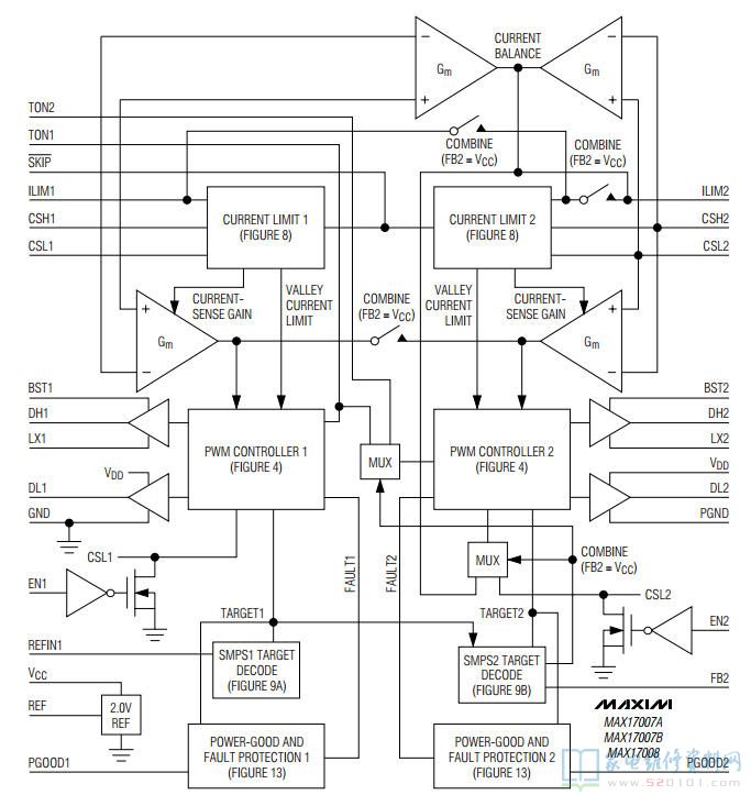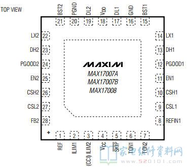 通过改变REFIN1引脚的电压动态调节SMPS1的输出电压。该器件包括0.5%精度的基准,用于设置REFIN1电压。外部5V偏置电源为内部电路及其栅极驱动器供电。
