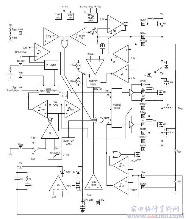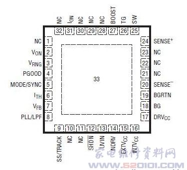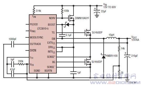 概述:LTC3810H-5采用5mmx5mmQFN-32封装。为高输入电压同步降压型 DC/DC 控制器,该器件在气温高达150°C 时有保证的性能规格。运用恒定接通时间谷值电流模式控制架构,无需检测电阻器且可以准确的逐周期限流提供了非常小的占空比和极快的瞬态响应。能够直接将电压从60V 降至一个数值范围为0.8V 至93% VIN 的输出电压。强大的1Ω 内置栅极驱动器最大限度地减少了由于以高频和高电压驱动 N 沟道 MOSFET (旨在提供高达 25A 的输出电流) 所引起的开关损耗。应用包括电信和数据通信中的 48V 功率转换、以及容易遭受高浪涌电压的汽车和工业系统。 具有可设置为低至100ns 的可调最短接通时间,从而在高频时实现了高降压比。工作频率从 100kHz 至 1MHz 是可选的,或可同步至一个同样范围的外部时钟。还可以配置为脉冲跳跃工作模式,以在轻负载时保持高频率。其他特点包括可编程软启动或跟踪、可调逐周期限流、输出过压保护、电源良好输出信号和可编程欠压闭锁。