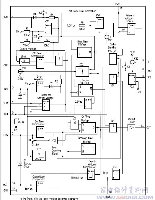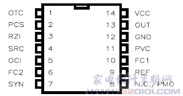 TDA16847-2的5脚(OCI)输入电压范围扩大到0V,该脚与地之间不再需要连接电阻;7脚(SYN)改进了启动特性,阻止了变压器饱和;11脚(PVC)通过加入尖峰信号消隐,提高了抗噪扰能力;13脚(OUT)减小了截止态输出电压电平;14脚(VCC)通过尖峰消隐,改善了抗噪性能。