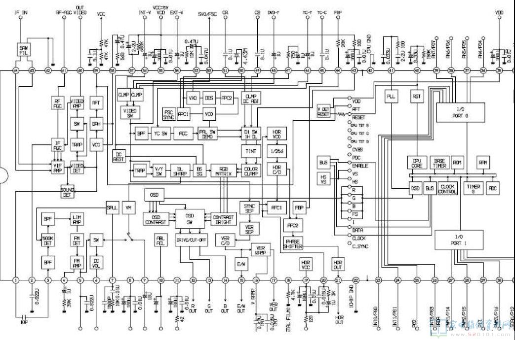 概述:LA76933采用64脚封装。主要特点:中频信号电路置于芯片内部,采用无需调整图像中频和伴音中频的PLL(锁相环)解调器,利用带通滤波器选出不同第二伴音中频(4.5/5.5/6.0/6.5kHz)。内置陷波器和带通滤波器对视频信号进行亮/色分离。其中,采用陷波器选出亮度信号Yo采用带通滤波器。选出色度信号C;彩色通道包括无需调整的锁相环解调器和NTSC制式TINT色调控制。行行激励脉冲由4.433MHz色副载波,通过1/256分频和行分频(H-C/D)电路形成,行脉冲形成:采用两个控制环路,具有自由调整行同步功能。OSD显示字符振荡和控制也置于内部电路;芯片内部设计有速度控制功能。芯片内部各相关电路之间采用IIC总线连接控制;在亮度和RGB基色信号处理电路中,设计有改善图像质是的峰化、黑延伸及动态肤色校正电路。芯片内部独有的连续阴极GB控制电路,可实现白电平及黑电平偏移调整,分别调整屏幕上暗淡部分与明亮部分的色温。用在25英寸以上的芯片内置有E/W东西枕校脉冲形成电路,输出E/W脉冲信号到枕校功率放大电路,以实现枕形失真校正。