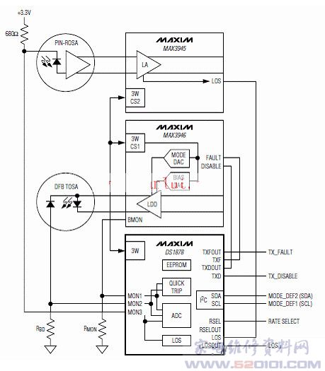 概述:采用带有裸焊盘的小尺寸、5mm x 5mm、28引脚TQFN封装, 工作电压为+2.85V 到+5.5V.。工作在-40°C至+95°C温度范围。持基于VCSEL, DFB和EML的解决方案。