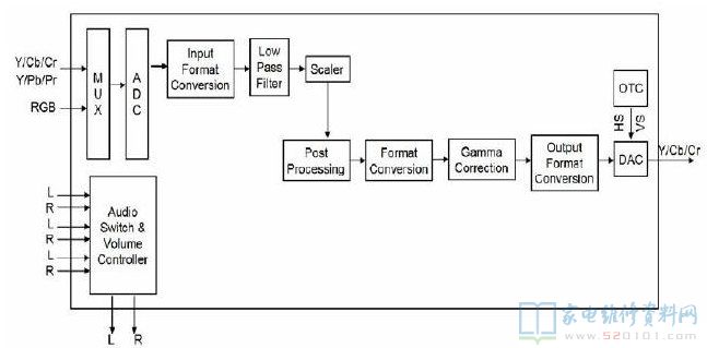 HDTV或VGA信号在同步锁定取样时钟信号及l2C总线信号指令控制下,进行ADC转换、格式转换、DAC转换、色度解码处理产生YCbCr信号从(35)、(36)、(39)脚输出,再经LCπ型滤波器滤除高频干扰信号后,经插座CN501送入主板的小信号处理块TMPA8873的YCbCr脚,由TMPA8873进行亮色解码处理。