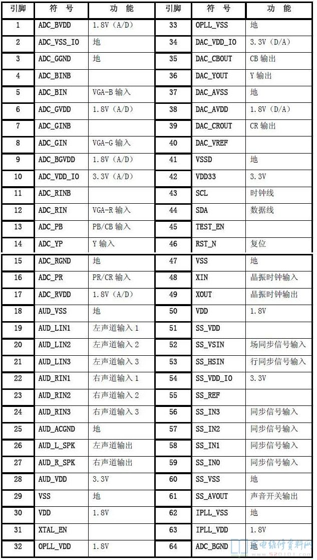 概述:HTV-158采用64脚封装。此芯片主要用于将VGA信号、HDTV(高清信号)转换成普通的YCbCr信号,再送入主板TMPA8873进行YCbCr信号处理及显示。实现普通CRT显示高清及VGA节目源,使电视图像效果与普通电视机送入的DVD信号效果接近。目前国内各品牌厂家准高清电视产品工作方式均与此相似。由图1(见397页)可以看出:IC电路组成简单,整个数字在主控I2C总线控制下进行变频处理,IC内外未设置动态帧存储器,故准高清电视显示画面与高清或VGA节目源在其他高清电视上显示的效果存在一定差异,准高清电视显示VGA或HDTV效果与普通CRT显示DVD效果相当。