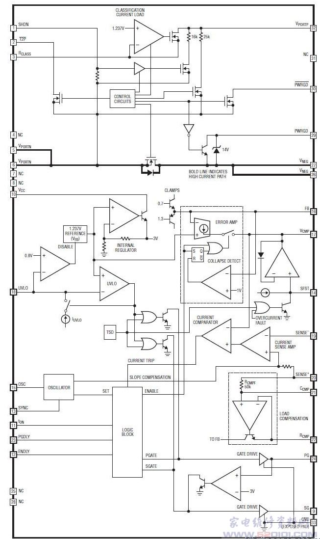 概述:LTC4278采用紧凑型32引脚7mmx4mmDFN封装。为 IEEE 802.3at 兼容的以太网供电 (POE+) 接口控制器。具有集成的开关稳压器,面向高达 25.5W 及更高功率的大功率受电设备 (PD) 应用。新的 IEEE 802.3at 定义 (也称为 PoE+ 标准) 同时扩大了功率预算,改善了供电设备 (PSE) 和受电设备用来互相识别的分级机制。支持两事件分级,与 IEEE 802.3af 设备是向后兼容的,为进一步提高以太网供电应用的水平创造了条件。这些器件集成了PD控制器、以及一个同步反激式控制器。 迎合了新一类采用新 PoE+ 标准的应用,包括视频会议站、RFID 阅读器、PTZ (左右-上下-变焦) 安全摄像机和长距离无线接入点。或者将 PSE 和 PD 识别为符合 IEEE 802.3af 功率级的 1 类硬件,或者识别为符合 IEEE 802.3at 功率级的 2 类硬件,并相应地分配功率。两事件硬件分级允许一个 2 类 PSE 识别至 2 类 PD 的连接,并向该 PD 发出信号,表明它能够提供与 802.3at 功率有关的较高功率级。这种新的分级机制确保 1 类和 2 类设备之间的互操作性。