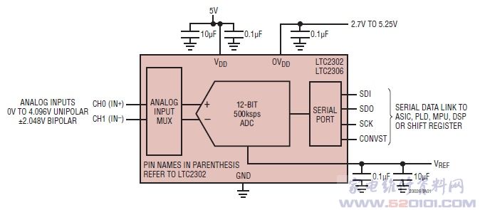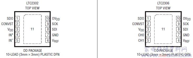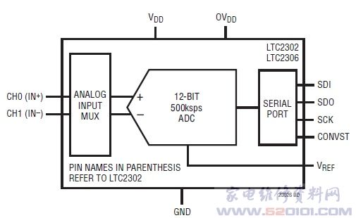 一个差分输入(LTC2302)/两个单端输入(LTC2306)