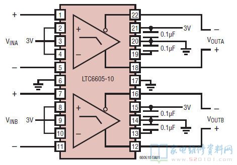概述:采用小外形22引脚6mm x 3mm x 0.75mm DFN 封装。低噪声、低失真差分放大器的双通道、匹配、10MHz滤波器。工作电压2.7V至5.25V 电源电压范围。包含两个独立的全差分放大器,被配置成匹配的二阶 10MHz 低通滤波器。滤波器的 f-3dB 在 9.7MHz 至 14MHz 范围是可调的。