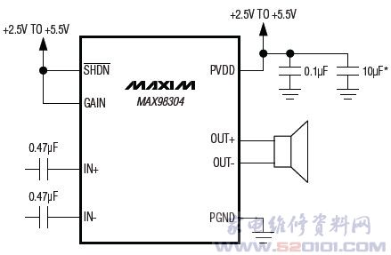 概述:MAX98304提供AB类音频性能和D类效率,提供五种引脚选择的增益(0dB,3dB,6dB,9dB和12dB),3.7V的静态电流0.95mA,超低噪音19μVRMS,PSRR为90dB,开关噪音抑制,热和过流保护,低电流关断模式。