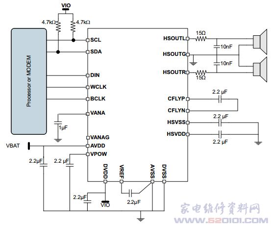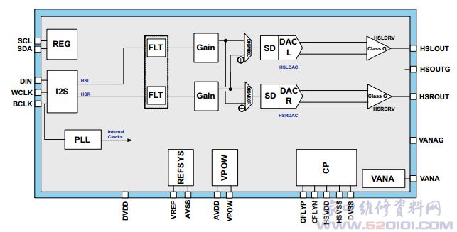 概述:TLV320DAC3202采用0.5毫米间距、2毫米x2.5毫米WCSP封装。是集成了DAC和电源的高保真高效低功耗G类耳机放大器,静态功耗6.5mW, SNR为100dB(A),内置了短路保护,支持8-, 11.025-, 12-, 16-, 24-, 32-, 44.1和48-kHz取样频率,数字控制I2C接口,支持16,20,24和32位数据宽度,32步音量控制(4dB到-59dB)。