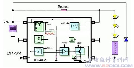 概述:ILD4035驱动电流高达350mA,输出电流可用外接电阻调整,输入电压4.5V-42V,具有过流和过压保护,LED开路保护,软起动,模拟电压和PWM调光,工作电压范围内关断电流小于100nA,输出电流精度3%.