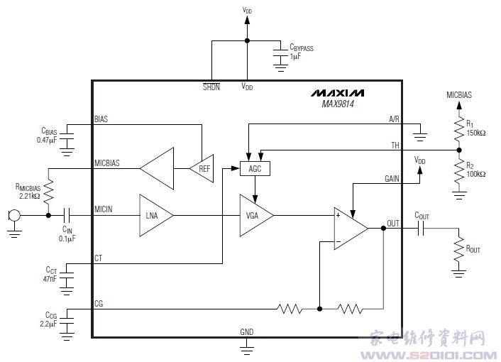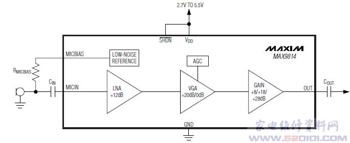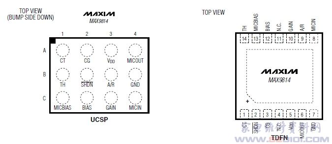 概述:MAX9814采用节省空间的、1.5mmx2mm、12焊球UCSP封装以及3mmx3mm、14引脚TDFN封装。定工作在-40℃至+85℃扩展级温度范围。内置自动增益控制(AGC)以及低噪声麦克风偏置。集成的AGC电路允许设计人员定义保持和释放时间、以及输出门限电平。在数字处理之前先对信号电平进行优化,可以保证信号的低噪声,从而无需进行进一步放大或衰减。随后可以在数字域内对该高品质音频信号进行无损转换和处理,从而保持了原有信号的音质。该器件集成低噪声前置放大器、可变增益放大器(VGA)、输出放大器以及内部低噪声麦克风偏压发生器,进一步提高了音频性能,可用于驱动绝大多数电容式麦克风。工作在-40℃至+85℃扩展级温度范围。