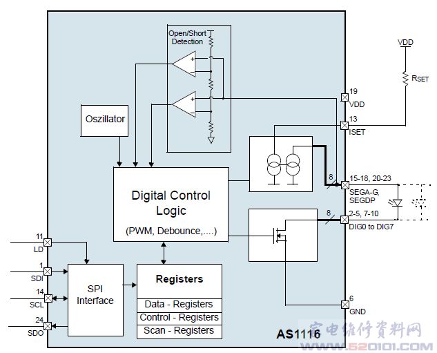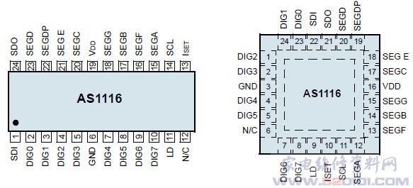 概述:AS1116采用0.6mm薄型TQFN(4x4mm)24引脚QSOP封装。工作电压为单2.7V至5.5V,工作时最低仅需0.6mA供电电流,而关断模式下仅为200nA。是带误差检测的 64 路LED驱动器,能驱动64个LED或8位7段LED,器件还可通过10MHz SPI兼容的3线接口进行编程。具有LED开路或短路检测,全部或单个误差检测,可进行单位亮度控制。 能以每数字位47mA电流来驱动8个7段数字位,或以每LED 5.5mA驱动64个独立LED。能够很容易地通过一个外置电阻来设定电流。具有±3%的极佳精度,使LED及LED模块之间的亮度差异降至最小,从而提升了LED显示器的画质。器件还采用了一个4位PWM来实现全局数字亮度控制和16步长的数字位独立调光。