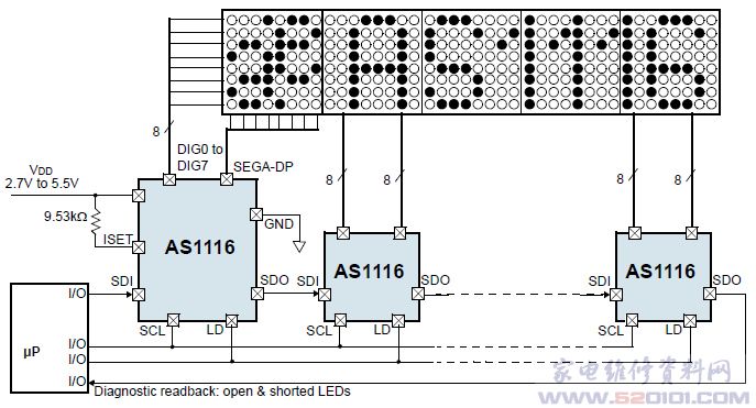 AS1116的一项独特功能是内置了LED错误检测功能,其友好的用户软件接口使用简单而直观,可在正常工作时非常容易地启用该功能,从而确保及时检测错误。可检测多路复用 8x8 LED阵列中的任何开路或短路故障,并利用具体的错误报告显示故障LED的确切位置。