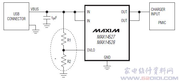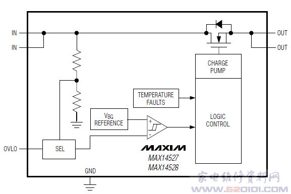 内置RON为100mΩ (典型)的FET,能够在高达+28V的故障电压下有效保护低压系统。当输入电压高于过压门限时,内部FET断开,以防止损坏被保护电路。过压保护门限可以通过外部电阻设置在4V至8V之间。当OVLO输入设置低于外部OVLO的选择电压时,将自动选择内部±2.5%精度的门限。内部过压门限(OVLO)预置为6.76V典型值(MAX14528)。还利用内部热关断提供过流保护。