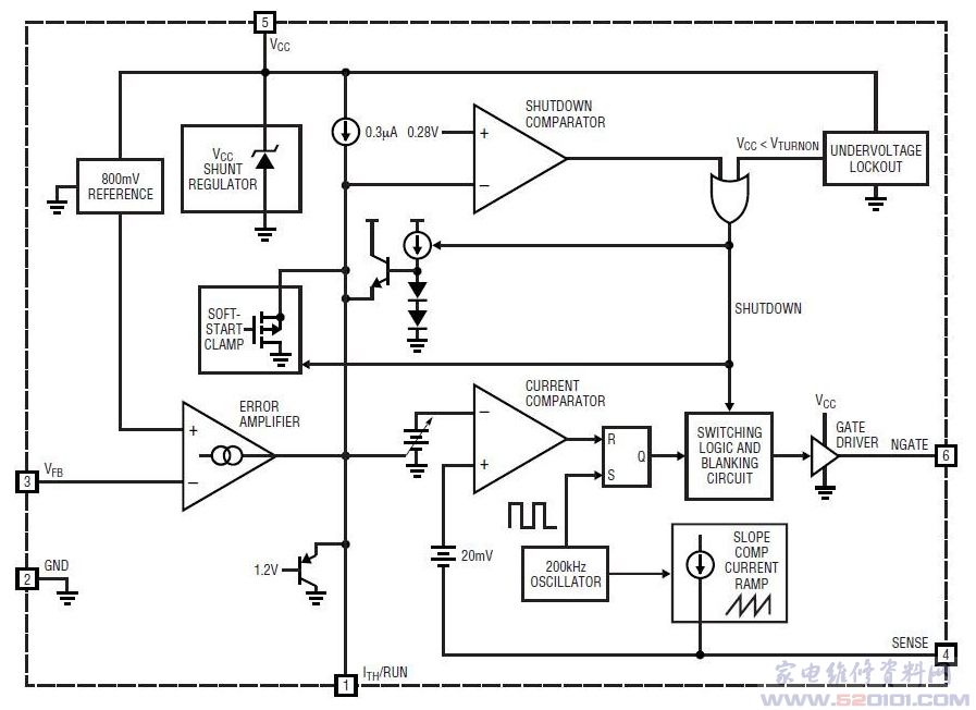 是一款恒定频率、电流模式、反激式控制器,专为在高输入电压应用中驱动 N 沟道 MOSFET 而优化。可在输入低至 5 V 的条件下运作。恒定频率操作一直保持到负载非常轻的条件下,从而在一个很宽的负载电流范围内产生较少的低频噪声。斜率补偿可利用一个外部电阻器来设置。 参考于地的电流检测使得转换器能够接受超过绝对最大 VCC 的输入电源。为简单起见,由于其内部并联稳压器的原因,可以通过一个电阻器从高 VIN 来供电。当输入电压太低时,一个内部欠压闭锁电路关断 LTC3803-5,从而向外部 MOSFET 提供足够的栅极驱动。