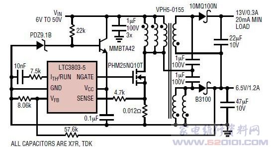 概述:LTC3803-5采用6脚封装,输入电压可低至5V,输出电压精度±1.5%,静态电流仅为240μA,工作温度从-40℃到150℃,可用于12V和42V汽车电源。