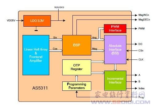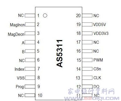 概述:AS5311采用20引线TSSOP封装,可在3.3V或5V电源电压下工作,规定环境温度范围为-40°至+125°C。与2mm极对长度的磁条一起使用,可通过其增量输出和串行输出分别提供1.95微米和488纳米分辨率的信号。