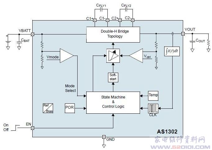 概述:AS1302采用1.2×1.2mm、WL-CSP8焊球封装,工作环境温度为-40到+85℃。输出电流可高达30mA,输入电压为2.9V至5.15V。在1:1模式下高达99%,在1:2或2:3模式下高达90%,且能够提供最低的静态电流。关断模式下电流仅10nA。