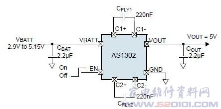 为30mA自适应无电感升压转换器,采用双H桥电荷泵和两个外接的快速电容器(flying caPACitor)。 其电荷泵具有1:2,1:3和1:1工作模式,固定工作频率1.2MHz,输入电压从2.9V到5.15V,稳压5V输出,精度为3%。
