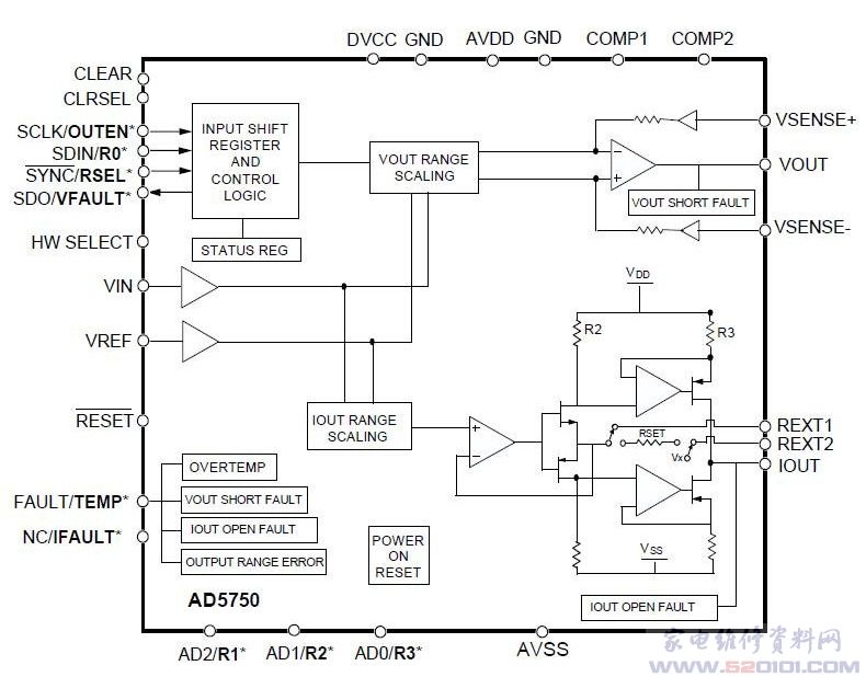 概述:AD5750采用5mm×5mmLFCSP32脚封装,采用±12V~±24V的双电源供电,能够提供四个输出电压范围(0~5V、0~10V、±5V、±10V)和五个输出电流范围(4~20mA、0~20mA、0~24mA、±20mA、±24mA),并具有20%的超额定值工作能力。