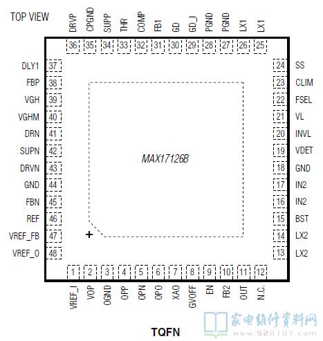 | 45 | FBN | 负电荷泵稳压器反馈输入。将 FBN 连接到负输出和 REF 之间的电阻分压器的中心,以设置负电荷泵稳压器输出电压。将电阻分压器放置在距 FBN 5mm 的范围内。 |