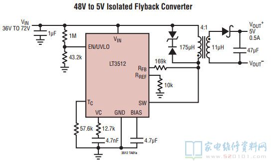 LT3512 运用边界模式操作,此模式是一种电流模式控制开关方案,可在整个电压、负载和温度范围内实现优于 ±5% 的稳压。边界模式也被称为临界导通模式,与同等的连续导通模式设计相比,它允许使用较小的变压器。输出电压能够很容易地利用两个外部电阻器和变压器匝数比来设定。